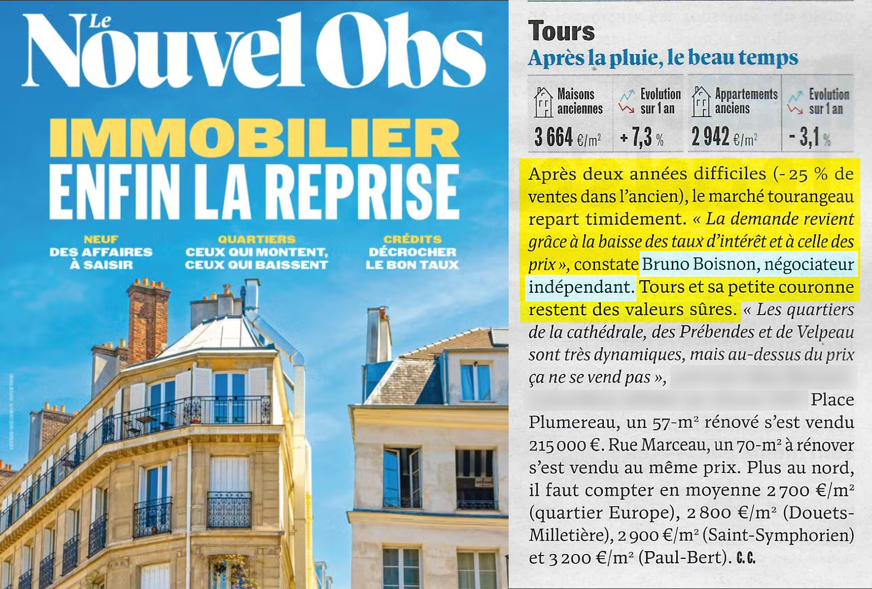 Cité dans Le Nouvel Obs comme référence du marché immobilier à Tours, cette mise en avant est une belle reconnaissance de mon expertise et de mon engagement professionnel.